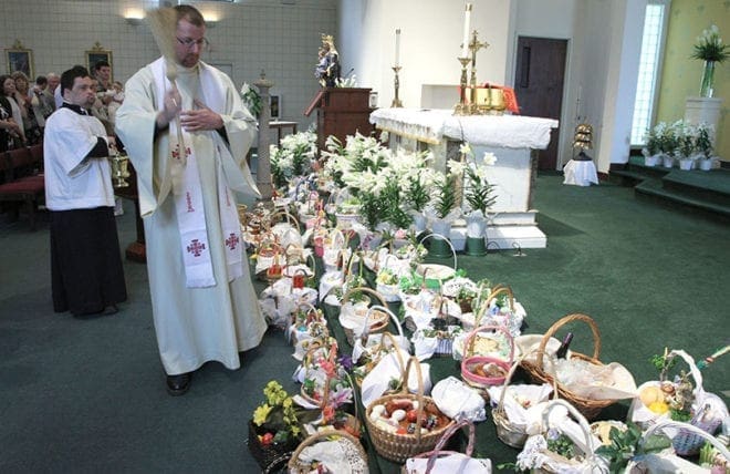 Father Piotr Nowacki of the Polish Apostolate at St. Marguerite d’Youville Church, Lawrenceville, blesses the traditional Polish Easter baskets brought by the families in the congregation. Photo By Michael Alexander