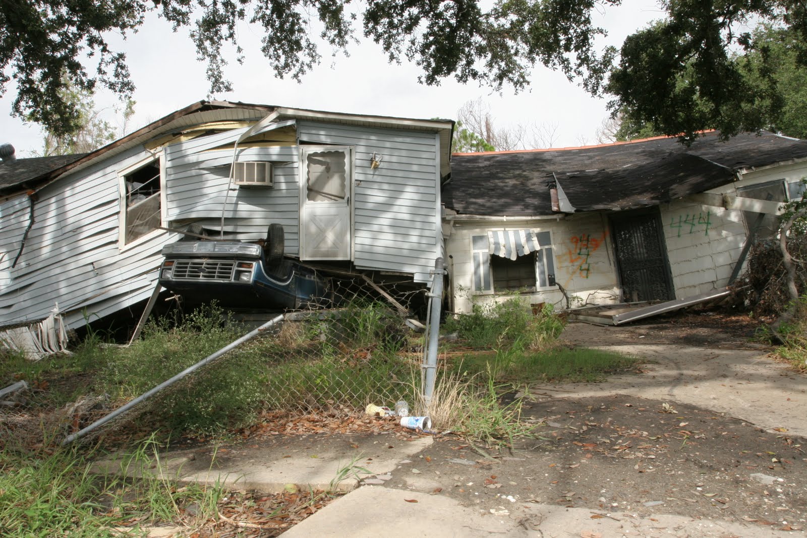 While some homes had been demolished in New Orleans’ Lower 9th Ward, nearly a year later others remained topsy-turvy by the force of the water.