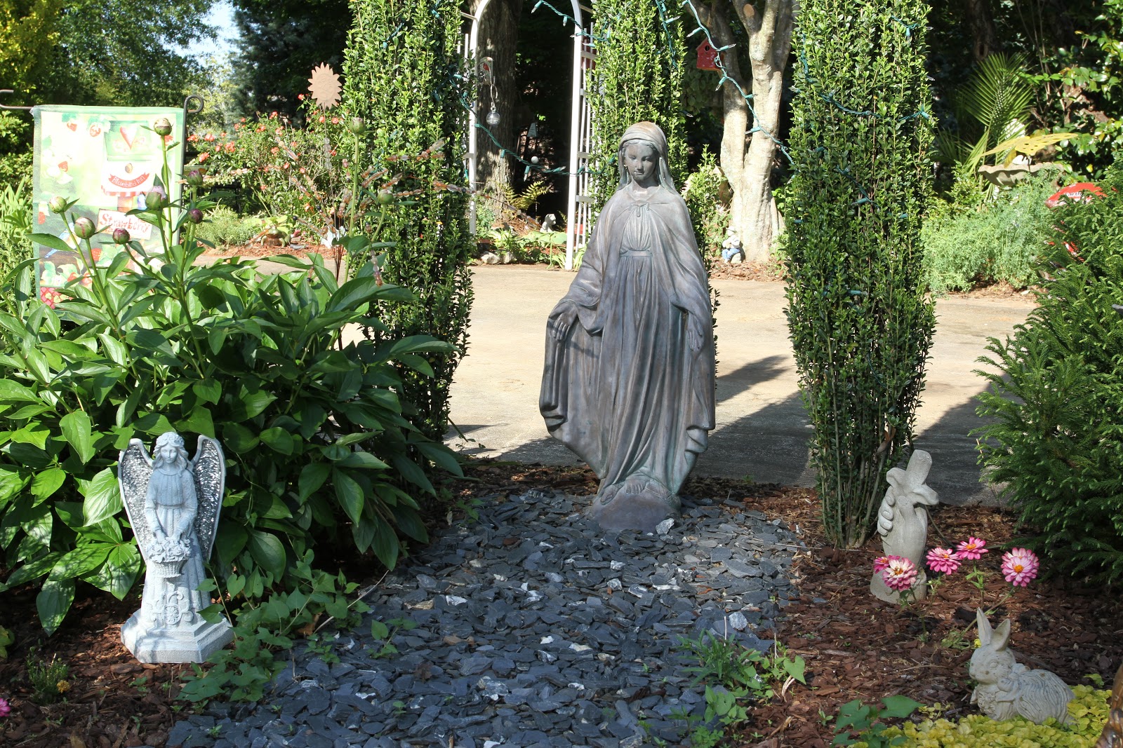 It all started after they became members of St. Peter Chanel Church. Gloria began attending morning Mass, former pastor Father Frank McNamee (now Msgr. McNamee) served as a source of inspiration and they grew stronger in their faith. Over time the garden flourished with a number of lovely, carefully placed religious articles. Some came from the Monastery of the Holy Spirit, Conyers, while others came from local nurseries and stores.