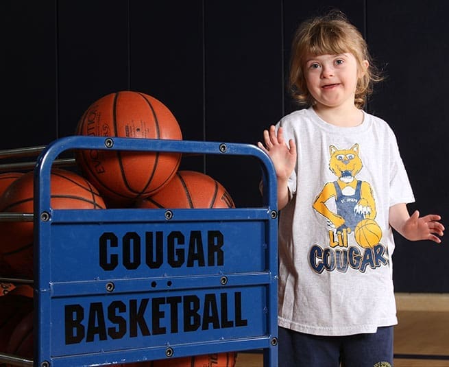 Six-year-old Hannah Foy, who has Down Syndrome, participated in St. Joseph School’s Little Cougars developmental and instructional co-ed basketball program during the 2013-14 season. Photo By Michael Alexander
