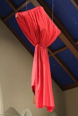 Hanging high above the altar, the 146-pound crucifix, with its six-foot corpus, was electronically lowered. The red cover was removed and it was replaced with the white drape of the resurrected Christ. It was a glorious look, becoming of a Messiah who was victorious in his conquest of sin and death on our behalf.