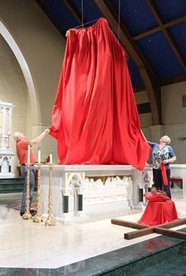 St. Peter Chanel Church facilities support Dave Petit, left, and event coordinator Doni Strok remove the red cover from the crucifix. Photo By Michael Alexander