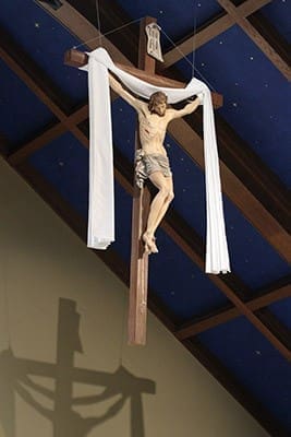 Draped in the white of the resurrected Christ, the 146-pound crucifix, with its six-foot corpus, was hand carved and hand painted in Italy. Photo By Michael Alexander
