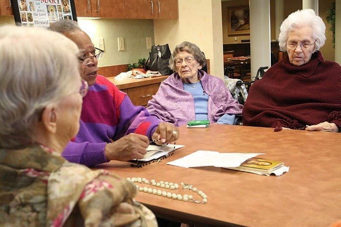 David Waters, second from left, leads the rosary last November as Virginia Stearns, far right, joins a host of fellow residents, including Pat Swenson, far left, and Trudy Melun, second from right. Photo By Michael Alexander