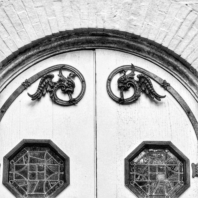 The wrought iron ornamentation on the door is fancy. It sort of resembles keys.