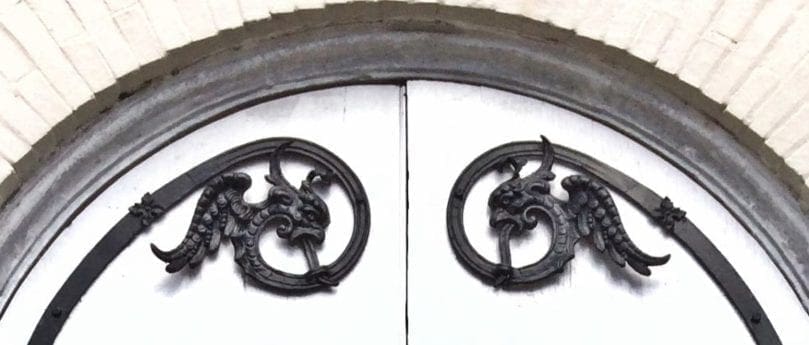 The wrought iron ornamentation on the door is fancy. It sort of resembles keys.