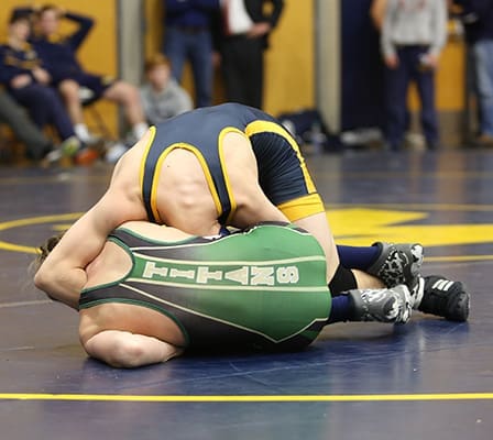 In this 152-pound weight class match, January 17, between Blessed Trinity sophomore Vincent Baker, top, and Pinecrest Academy’s Robert Redecker, my eye is drawn to the circular motion of Baker’s arms and shoulders and Redecker’s right leg. Photo By Michael Alexander
