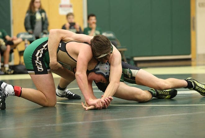 Two bodies with one head provides an interesting visual as Blessed Trinity's Noah Kile, left, and Marist School's Reed Bethune wrestle in last year's Catholic Duals. Photo By Michael Alexander