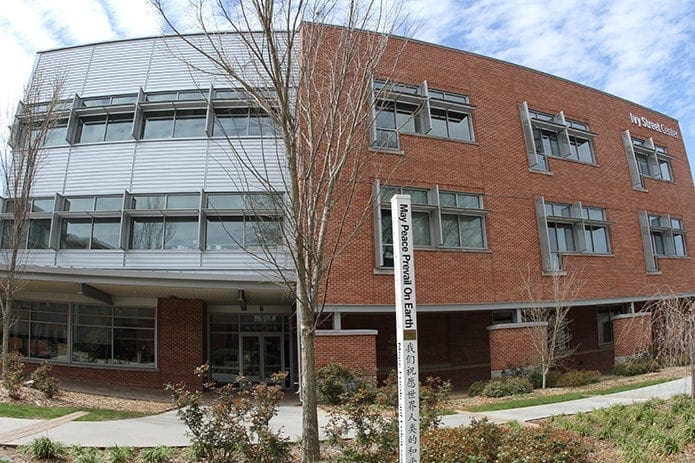 Cristo Rey Atlanta Jesuit High School has a Peace Pole, which was blessed back in September 2016 during the campus ministry team’s “Campaign Nonviolence Week of Actions.” At the school’s old campus on West Peachtree Street, the pole was planted in a small meditation garden. Today, the Cristo Rey Peace Pole is displayed in front of their new building on Piedmont Avenue. Their pole bears the same message in four languages (English, Spanish, Vietnamese and Amharic).