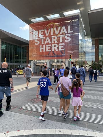 Pilgrims head into Lucas Oil Stadium for the National Eucharistic congress. Photo by Andy Lichtenwalner
