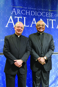 Marist Father Joel M. Konzen, left, the newly named Auxiliary Bishop for the Archdiocese of Atlanta, stands with Archbishop Wilton D. Gregory as the Feb. 5 morning press conference prepares to get underway. Photo By Michael Alexander