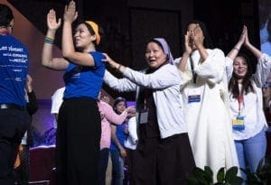 Delegates celebrate the Sept. 23 closing session of the Fifth National Encuentro, or V Encuentro, in Grapevine, Texas. The Sept. 20-23 gathering brought together more than 3,200 Hispanic Catholic leaders and about 125 bishops from across the country. CNS photo/Tyler Orsburn