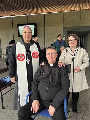 Every year, the Order of Malta brings the sick, whom they call “malades” and designated companions to Lourdes, France. Father Paul Burke, seated, of Atlanta, made the pilgrimage as a “malade” and was accompanied by his sister, Anne Burke-Liston of Dublin, Ireland, and Archbishop Gregory J. Hartmayer.