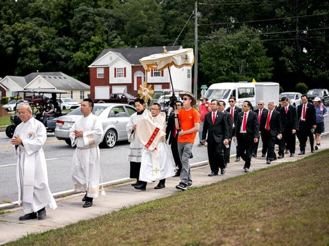Bishop John Nhàn Tran processes with the Blessed Sacrament toward Our Lady of Vietnam Church in Riverdale, accompanied by the clergy and members of the parish. The June 21 procession was part of the National Eucharistic Pilgrimage. Photo by Johnathon Kelso