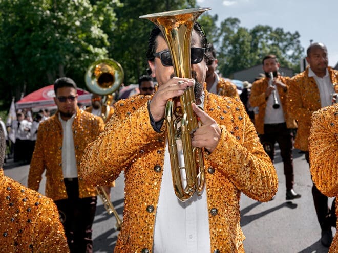 Mujeres vestidas con capas coloridas con Nuestra Señora de Guadalupe encabezaron la procesión y cantaron relajantes himnos en español a la Eucaristía y a los peregrinos. Músicos vestidos con relucientes trajes dorados interpretaron canciones; su música resonó todo el camino hasta los terrenos de la iglesia. Un grupo de artistas con coronas de flores bailaron con maracas y tambores y cayeron de rodillas ante la presencia del Santísimo Sacramento.