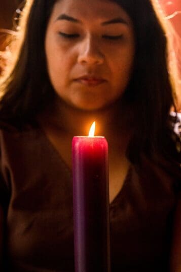 A young woman prays in front of a purple Advent candle. Advent is a season of waiting. CNS photo/Lisa Johnston, St. Louis Review