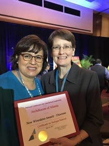 Monica Oppermann, left, associate director, and Amy Daniels, director of the archdiocesan Office of Formation and Discipleship, accepted the New Wineskins Award for the archdiocese’s Spanish certificate program in pastoral theology. The award was given at the 81st National Conference for Catechetical Leadership, held in Dallas May 22-25.