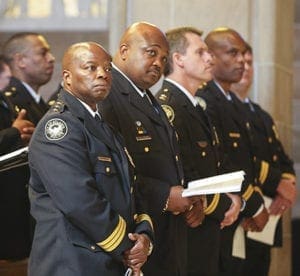 Atlanta Police Department officials including (front row, l-r) Assistant Chief Rodney Bryant, Police Chaplain Marc House, and Deputy Chiefs Jeff Glazier, Timothy Quiller and Michael Kreher stand for the reading of the Gospel during the Sept. 8 Blue Mass at the Cathedral of Christ the King, Atlanta. Photo By Michael Alexander