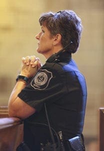 Marni Herman, a police officer for the Cobb County School District Police Department, kneels in prayer during the Blue Mass. This was Herman’s first time attending the annual Mass for public safety officials and first responders. She is a member of St. Vincent de Paul Church in Dallas. Photo By Michael Alexander