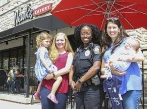 Brookhaven Police Department pedestrian safety Officer Maria Jones, second from right, poses for a photo after she shared lunch with (r-l) Erin Rogan, her 6-week-old son, Aidan, and her 3-year-old daughter, Audrey, held by Our Lady of the Assumption Church youth minister, Angela O’Donoghue. Erin is also holding a police onesie, a baby gift from Jones. Photo By Michael Alexander