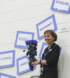 St. John the Evangelist School principal Karen Vogtner is presented with flowers during the Blue Ribbon celebration. The school has been selected a National Blue Ribbon School of Excellence two of its three times, 2010 and 2017, since Vogtner became the principal in 1998. Photo By Michael Alexander