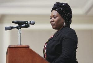 Jaasmeen Hamed was the fourth of five community leaders who addressed the audience present at the Oct. 26 community event commemorating renewed dialogue and partnership between Catholics and Jews. Hamed represented the Muslim faith community. Photo By Michael Alexander
