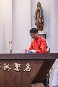 Ky Phanhsavath stands at the altar during the dedication of the Chinese mission, which is attended by people from Southeast Asian countries where Chinese immigrants put down roots. A native of Laos, Phanhsavath was baptized Catholic after he moved to Georgia as a teenager. Photo by Thomas Spink