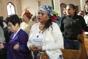 Cameroon Catholic Women’s Association member Margaret Bih joins others in praying the Our Father during the Jan. 20 Dr. Martin Luther King Jr. Eucharistic Celebration. Bih belongs to St. Lawrence Church, Lawrenceville. Photo By Michael Alexander