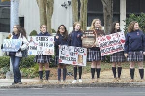 Eighth-grade students from St. Catherine of Siena School, Kennesaw, participate in the Jan. 22 Stand for Life Atlanta along Peachtree Road. The event, and the Mass for the Unborn preceding it, are sponsored by the Archdiocese of Atlanta’s Respect Life Ministry. Photo By Michael Alexander