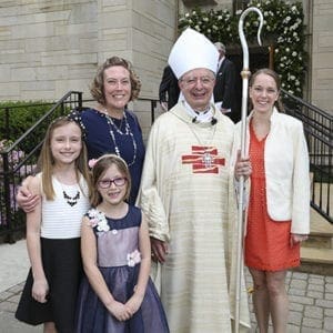 Bishop Joel M. Konzen, SM, takes a photo with (clockwise, from top left) Tammy (Steindam) Myers, her cousin, Claire (Steindam) Nyugen, and Myers’ daughters, Breanna and Allison. Myers, a longtime family friend of the bishop, is from his hometown, Oak Harbor, Ohio, and they share the same home parish, St. Boniface Church. Photo By Michael Alexander