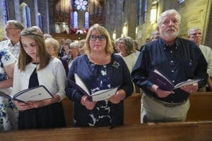 The relatives of Bishop-designate Joel M. Konzen (front pew, r-l), including his brother Raymond, his niece and Raymond’s daughter, Terese Struble, and Terese’s daughter, Riley, join a host of other relatives and friends for the April 2 vespers service at the Cathedral of Christ the King, Atlanta. Photo By Michael Alexander