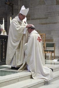As Archbishop Wilton D. Gregory conducts the prayer of ordination, the final step in conferral of the Office of the Episcopacy, the Book of the Gospels is held over Bishop-designate Joel M. Konzen, SM, by Deacon of the Altar, Rick Medina, left, and Deacon of the Word, Bill Garrett, both from All Saints Church, Dunwoody. Photo By Michael Alexander