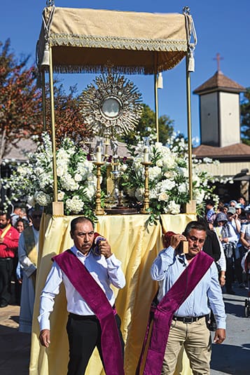 Un grupo rotativo de hombres y mujeres fue elegido entre la multitud para cargar sobre sus hombros el pesado altar de madera, lo cual los dejó con sus caras tensas y sudorosas. La gran custodia, con la Eucaristía, expuesta estuvo rodeada de flores blancas y velas.