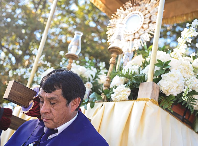 Un grupo rotativo de hombres y mujeres fue elegido entre la multitud para cargar sobre sus hombros el pesado altar de madera, lo cual los dejó con sus caras tensas y sudorosas. La gran custodia, con la Eucaristía, expuesta estuvo rodeada de flores blancas y velas.