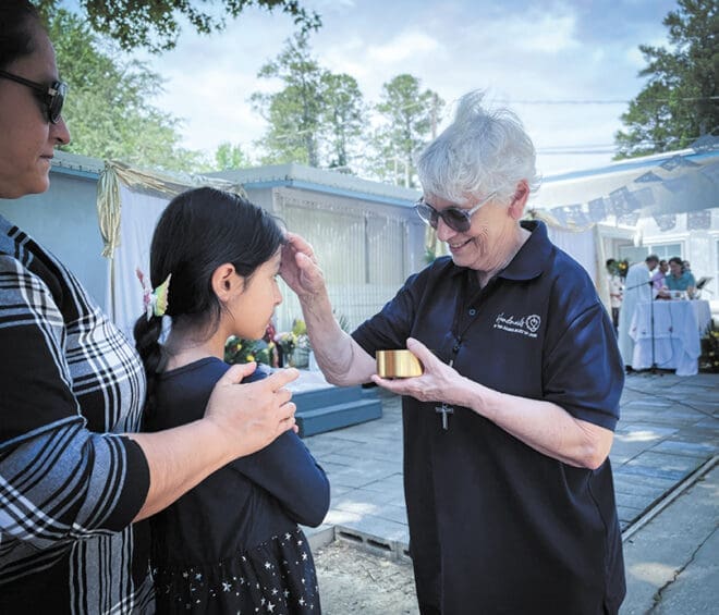 Después de la misa, una mujer, con el cabello corto debido a su tratamiento de cáncer de mama, compartió cómo la Hermana Margarita la acompañó al consultorio médico para traducir al español varias opciones complejas de su tratamiento. Para una joven graduada de la Universidad de Georgia, la experiencia de ser tutora en Oasis Católico, que conecta a estudiantes universitarios con el sitio de casas rodantes, le sirvió para salir de la burbuja universitaria. Otra joven, que creció en las casas móviles, dijo que la constante bondad de las hermanas ayudó a muchas personas que acudieron a ellas en momentos de necesidad.