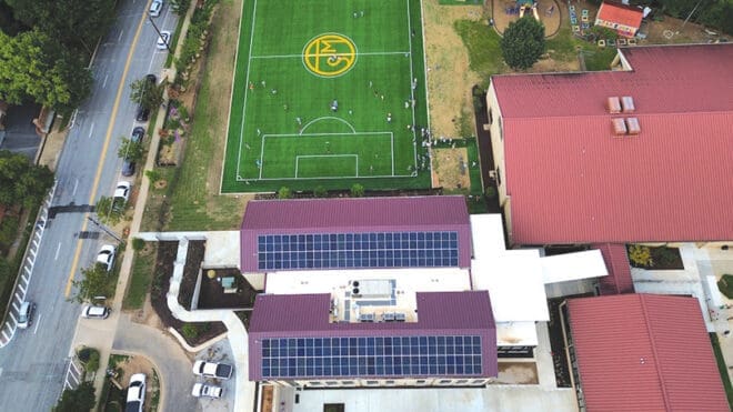 As part of the initiative to care for the environment, St. Thomas More School made history in installing 100 solar panels on the rooftop of the new school building, becoming the first Catholic school in Georgia to go solar. Photo Courtesy of Sunpath Solar