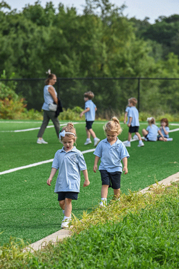 Pre-K students Elodie Modak, left, and Stella Piper, right, enjoy the sunshine during recess on the upgraded turf field at St. Thomas More School. Included in the campus-wide renovations, the installation of a water retention system beneath the surface of the turf field prevents flooding and protects the field from long-term damage. Photo by Julianna Leopold