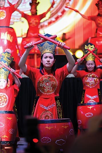 Una integrante de un grupo tradicional vietnamita de tambores se presenta en el festival de otoño de tres días de la iglesia de Norcross. La parroquia recibe la temporada cada año con una celebración gastronómica, misas y entretenimiento. Foto de Julianna Leopold
