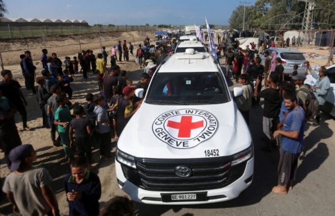 Palestinos se reúnen alrededor de vehículos de la Cruz Roja que transportan rehenes en el centro de la Franja de Gaza, el 13 de octubre, retenidos en Gaza desde el mortal ataque del 7 de octubre de 2023, luego de su entrega como parte de un acuerdo de cese el fuego y de intercambio de rehenes por prisioneros entre Hamás e Israel.