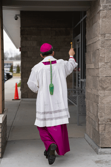 El Obispo John N. Tran recorre el recinto del nuevo hospital católico en Ringgold, utilizando agua bendita para bendecir las instalaciones médicas. Foto de Julianna Leopold.