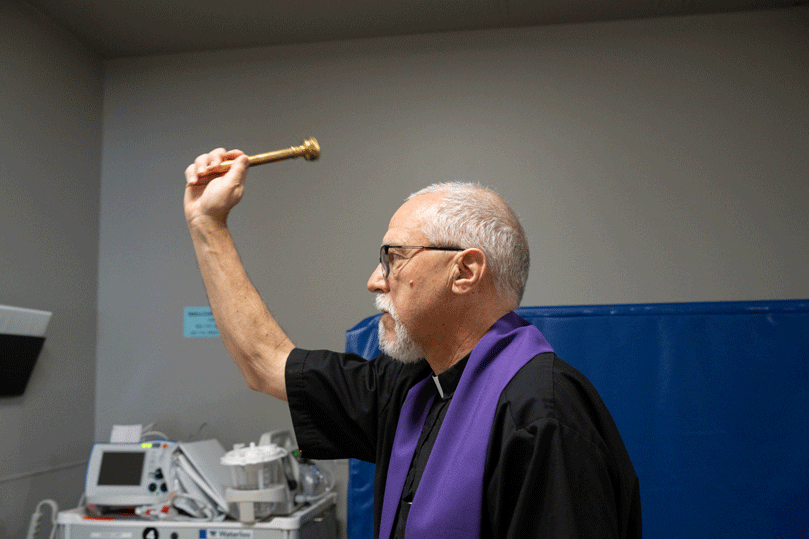 El Padre Mark Thomas, párroco de la Iglesia Our Lady of the Mount en Lookout Mountain, bendijo la unidad de cuidados intensivos con agua bendita y oró por los miembros del personal con quienes se cruzó en el camino y les expresó su agradecimiento.