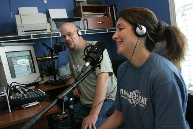 Greg’s office, the former walk-in closet in his bedroom that he lovingly refers to as the “master cloffice,” is painted Marian blue. The majority of his time is spent sitting in front of his two computers, updating the Rosary Army Web site, which gets at least 200 hits a day. He has also added podcasting, a sort of home radio broadcast, into the mix, and visitors to the Web site can listen to Greg and Jennifer speak about various Catholic topics. The podcasts can also be downloaded via iTunes.