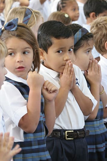 (L-r) Kindergarten students Cee Cee Ely, Juan Sanchez and Michelle Nguyen stand during the Sept. 20 Mass marking St. Mary’s 60th anniversary. Photo By Michael Alexander