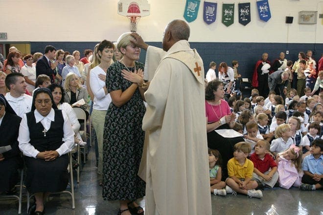 School receptionist Angie King receives a blessing from Archbishop Gregory during Communion. Photo By Michael Alexander