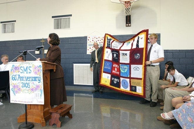 Standing at the podium, school admissions director Christa Jackson presents a handmade quilt, held up by principal Dr. Davis Nelson, left, and eighth-grader David Heller, to Archbishop Gregory on behalf of the St. Mary’s School community. Photo By Michael Alexander