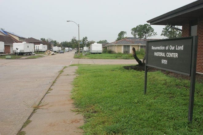FEMA trailers of the residents who have returned to the neighborhood can be seen from the pastoral center at Resurrection of Our Lord Church, New Orleans. Photo By Michael Alexander