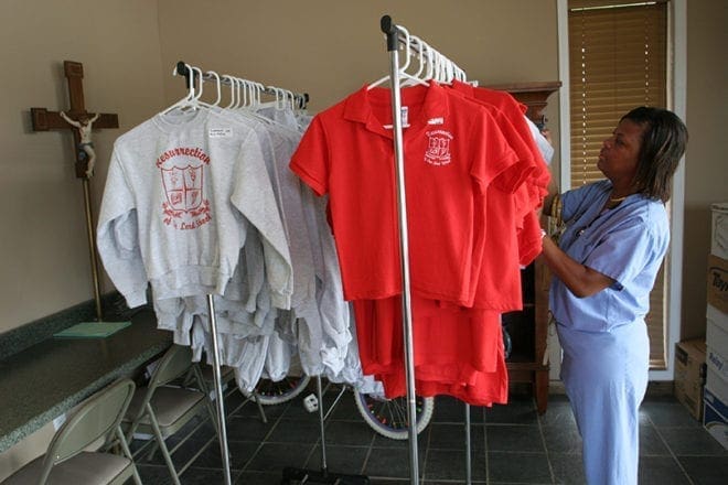 Registered nurse Shelia Mathieu shops for uniforms at Resurrection of Our Lord Church the last week in July. Her two daughters are 5th and 7th graders at the parish school this year. Mathieu’s family lived in Houston for four months following Hurricane Katrina before returning to New Orleans. Photo By Michael Alexander