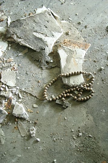 In the damaged home of John and Betty Browne, a souvenir rosary from the 1984 World’s Fair in New Orleans can be found on the floor among dry wall and other debris. Photo By Michael Alexander