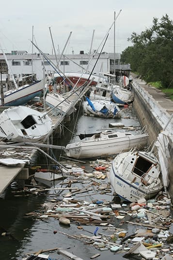 A drive along the harbor through the West End neighborhood of New Orleans as late as July reveals the boats and yachts that still remain tossed over on their sides. Photo by Michael Alexander