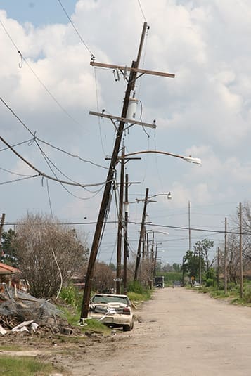 An abandoned car sits on Flood Street in the desolate Lower 9th Ward neighborhood of New Orleans amid leaning power line poles. Photo by Michael Alexander